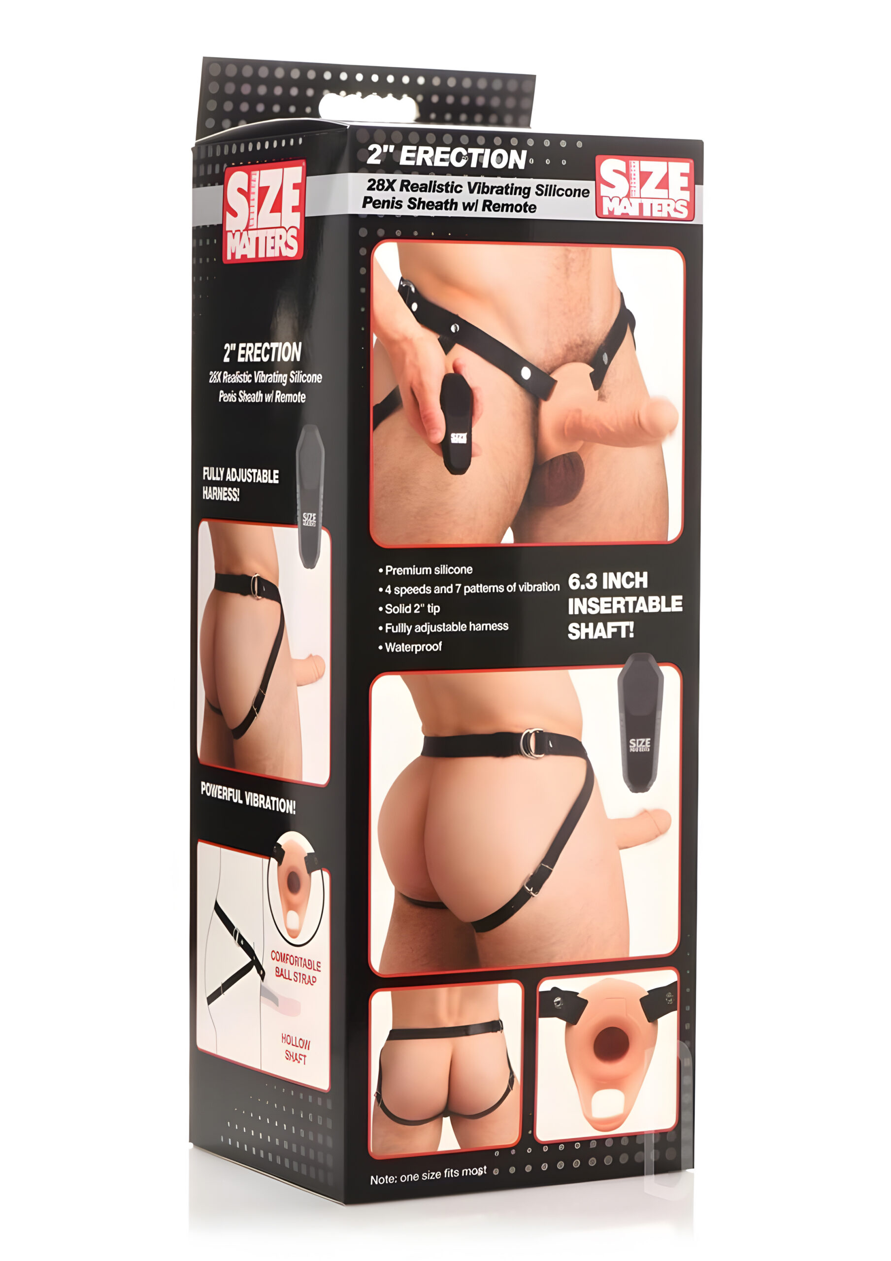 Unleash your inner sex machine with the 2 Inch Erection 28X Realistic Vibrating Silicone Penis Sheath, a hollow strap-on designed to give you a bigger, longer size that stays hard and vibrates for unparalleled pleasure. Ideal for those with ED or anyone seeking a more lifelike experience, this light-colored silicone sheath features a veiny shaft and realistic head to enhance your intimate moments. Control 4 speeds and 7 patterns of powerful vibration with a battery-operated remote, exploring a variety of sensations as you indulge in your fantasies. The sheath’s plush base and stretchy ring ensure a secure fit while providing gentle tugging on the testicles for added enjoyment. The adjustable PU leather harness guarantees a comfortable, customized fit with nickel-free metal belt buckles that adjust around the waist and thighs. Plus, the sheath is IPX7 waterproof, perfect for steamy shower play and hassle-free cleaning. To use, apply water-based lubricant to the sheath and your penis for a comfortable fit. Sync the remote with the vibrator, lube up your partner, and embark on a sensuous journey of realistic pleasure. The firm sheath remains hard even after climax, ensuring non-stop satisfaction for both of you. After use, wash the sheath with warm water and mild soap, then spray with toy cleaner and let air dry. Clean the PU leather harness with toy cleaner and a soft cloth. Experience the ultimate in lifelike sensation with the 2 Inch Erection 28X Realistic Vibrating Silicone Penis Sheath, featuring a hollow strap-on design, remote-controlled vibration, and adjustable harness for an unforgettable intimate adventure.
