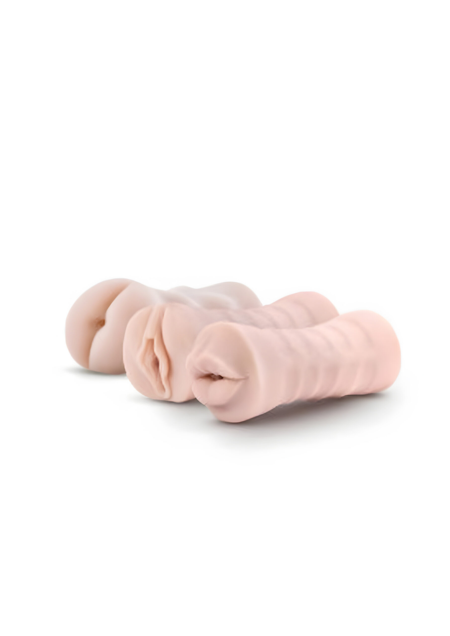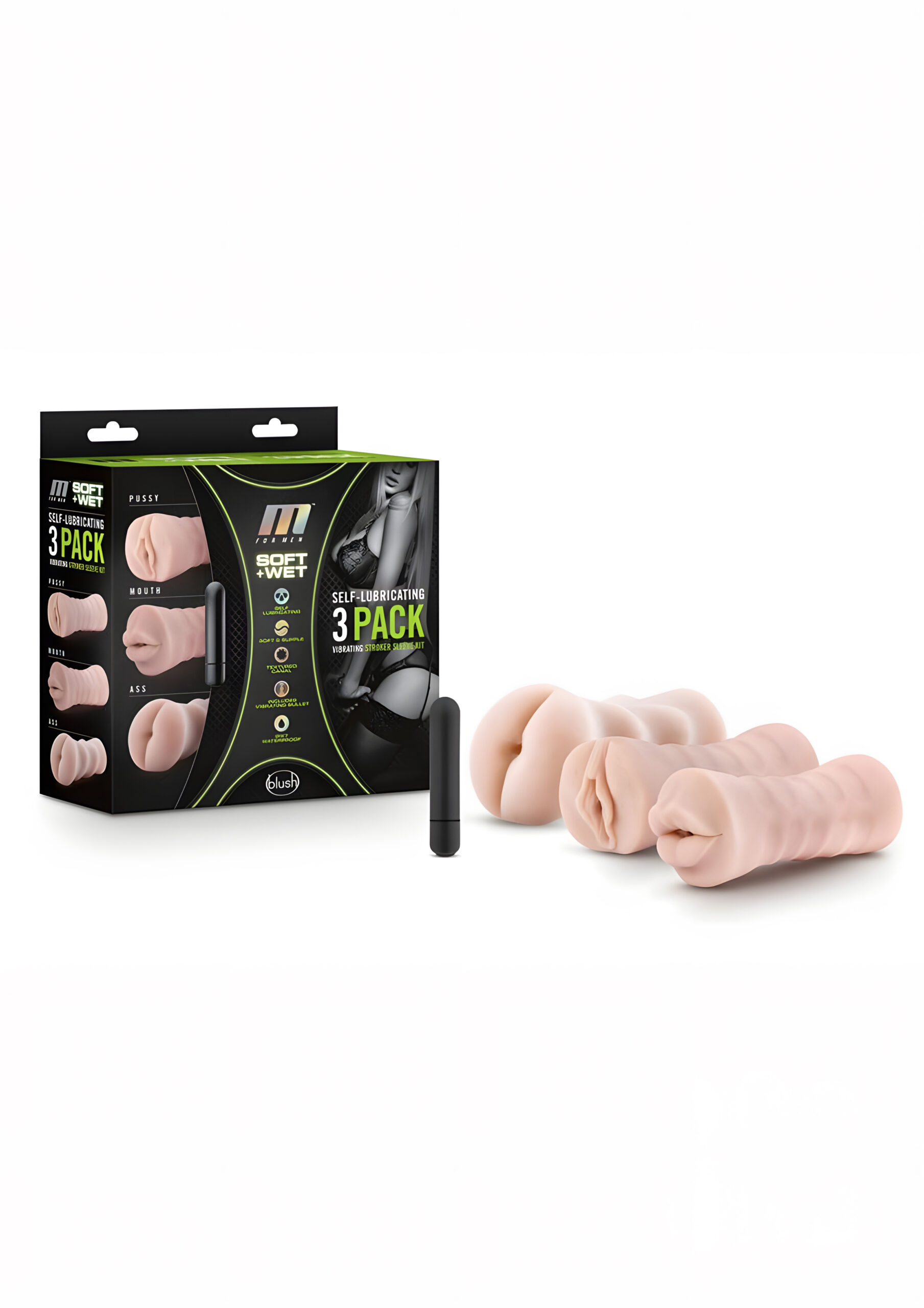The M for Men Soft & Wet Set is the perfect way to enjoy a lifelike experience every time. This kit includes three separate masturbator sleeves, each made of X5 Superior TPE material for a soft, yielding feel. The sleeves feature open-ended ribbed canals that can accommodate any size, and self-lubricating properties that can last up to 12 uses. The set also includes a single-speed vibrating bullet that requires one AAA battery (not included) for added sensation. The masturbator sleeves are body-safe and easy to clean, and contain no phthalates, paraffins, or latex. Whether you’re using it alone or with a partner, the self-lubricating properties of the masturbator sleeves make it easy to get started. Simply add a few drops of water to the sleeve and you’ll be ready to go. The vibrating bullet adds an extra layer of stimulation and can be used with any of the three sleeves. When you’re done, simply wash the sleeves with soap and water, pat dry, and allow to air dry before storing. Enjoy the lifelike feel of the M for Men Soft & Wet Set every time. Usage Suggestions: Ready to dive into the world of lifelike pleasure? Here are some tips to make the most out of your M for Men Soft & Wet Set: Preparation: Before you start, make sure you have a AAA battery on hand for the vibrating bullet. Trust us, you don’t want to be caught mid-session without power. Getting Started: Add a few drops of water to the sleeve. The self-lubricating properties will kick in, making the experience smooth and enjoyable. No need to fumble around with extra lube. Mix and Match: Feel free to experiment with the different sleeves and the vibrating bullet. Each sleeve offers a unique sensation, and the bullet can be used with any of them for added excitement. Solo or Partner Play: Whether you’re flying solo or have a co-pilot, the M for Men Soft & Wet Set is versatile enough to enhance any experience. Share the fun or keep it all to yourself. Cleaning: After your session, wash the sleeves with soap and water. Pat them dry and allow them to air dry completely before storing. This ensures they stay in top condition for your next adventure. Why Choose the M for Men Soft & Wet Set? Lifelike Feel: The X5 Superior TPE material provides a soft, yielding feel that mimics the real thing. It’s like having a VIP pass to pleasure town. Self-Lubricating: The sleeves’ self-lubricating properties make it easy to get started. Just add water and you’re good to go for up to 12 uses. Customizable Experience: With three different sleeves and a vibrating bullet, you can mix and match to find your perfect combination of sensations. Body-Safe: The sleeves are free from phthalates, paraffins, and latex, ensuring a safe and enjoyable experience every time. Easy to Clean: Maintenance is a breeze. Simply wash, dry, and store. No complicated rituals required. In conclusion, the M for Men Soft & Wet Set is your ticket to a lifelike and customizable pleasure experience. Whether you’re a solo adventurer or a team player, this set has something for everyone. So, grab your AAA battery, add a few drops of water, and get ready to explore new heights of satisfaction. Just remember to clean up afterward—no one likes a messy adventurer.
