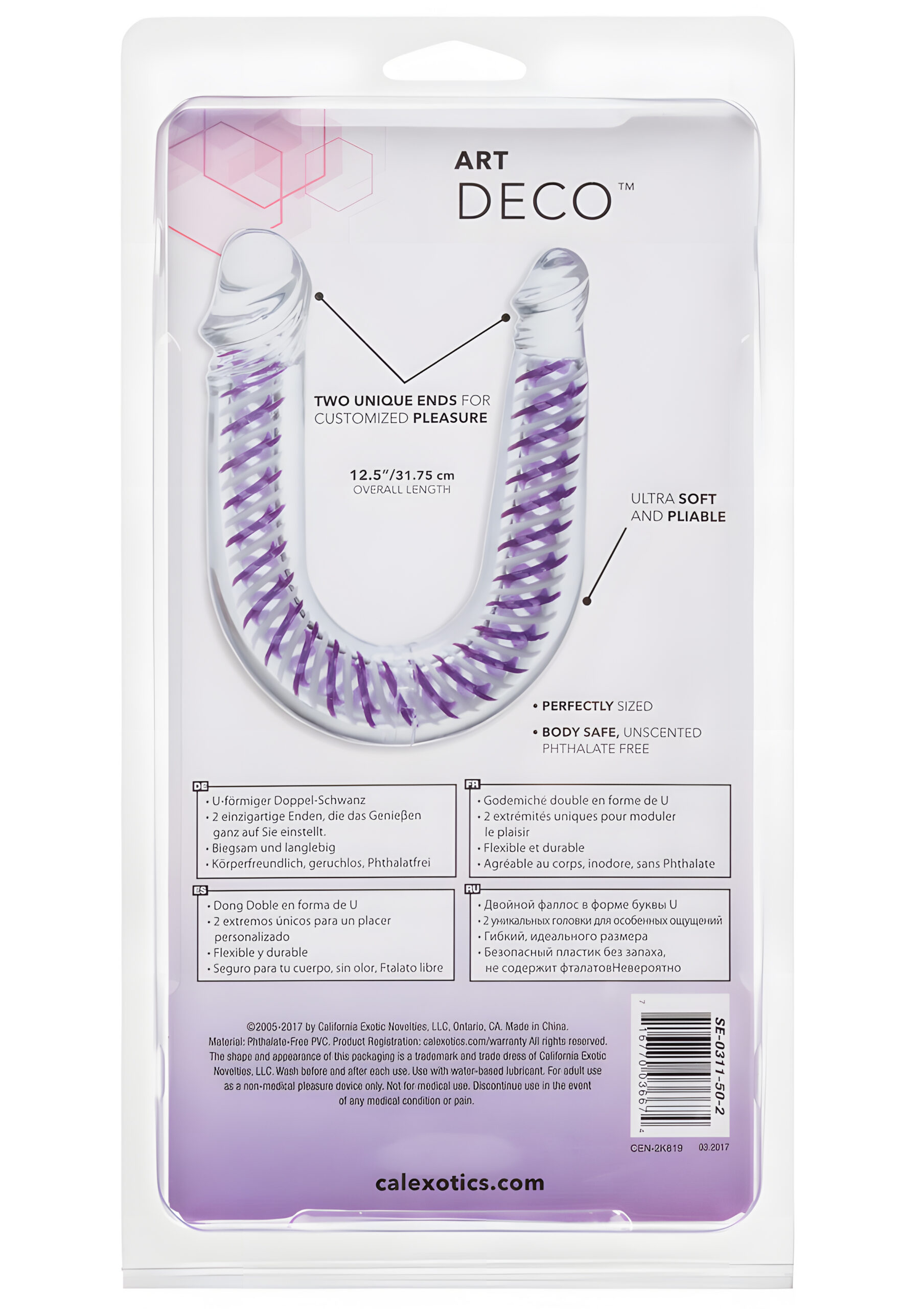 Discover double the pleasure with the Art Deco AC/DC Double Dong. This stylish adult toy is designed for women who want to experience twice the fun with stimulating sensations in both directions. Crafted from high-quality Crystalessence PVC, this jelly-soft dildo offers the ultimate double penetration experience. Whether you choose to use it independently or together, the AC/DC Double Dong promises a smooth and comfortable ride every time. The unique U shape of this double penetrator makes it the perfect combination of an anal plug and dildo, allowing for simultaneous vaginal and anal play. Measuring a generous 12.25 inches in length and 1.25 inches in width, it is an ideal size for both beginners and advanced users. The Art Deco™ AC/DC Double Dong is not only functional but also aesthetically pleasing, with a stylish designer touch that makes it as pleasing to the eye as it is exciting to use. Available in a clear color with a purple interior, this double dong is as visually appealing as it is effective. It is made from phthalate-free PVC, ensuring that it is safe for use anywhere on your body. The material is waterproof, allowing for versatile use in various settings, whether in the shower or the bedroom. With a weight of 6.8 ounces, it is lightweight yet substantial enough to provide the desired level of stimulation. To enhance your experience, it is recommended to use a good quality lubricant. This will not only increase comfort but also heighten pleasure. Remember to clean your toy before and after each use to maintain maximum hygiene. The Art Deco™ AC/DC Double Dong comes with a 1-year warranty, giving you peace of mind with your purchase. Color: Clear with purple inside Warranty: 1-year warranty Features: Phthalate-free Waterproof: Yes Material Type: Phthalate-free PVC Measurements: 12.25 x 1.25 inches Weight: 6.8 ounces The Art Deco™ AC/DC Double Dong is a versatile and stylish addition to any adult toy collection. Its unique design and high-quality materials make it a must-have for anyone looking to explore double penetration. With its generous size and comfortable jelly-soft touch, it is perfect for both beginners and seasoned users. So, why not add a touch of art deco flair to your intimate moments and enjoy the ultimate in double penetration pleasure?