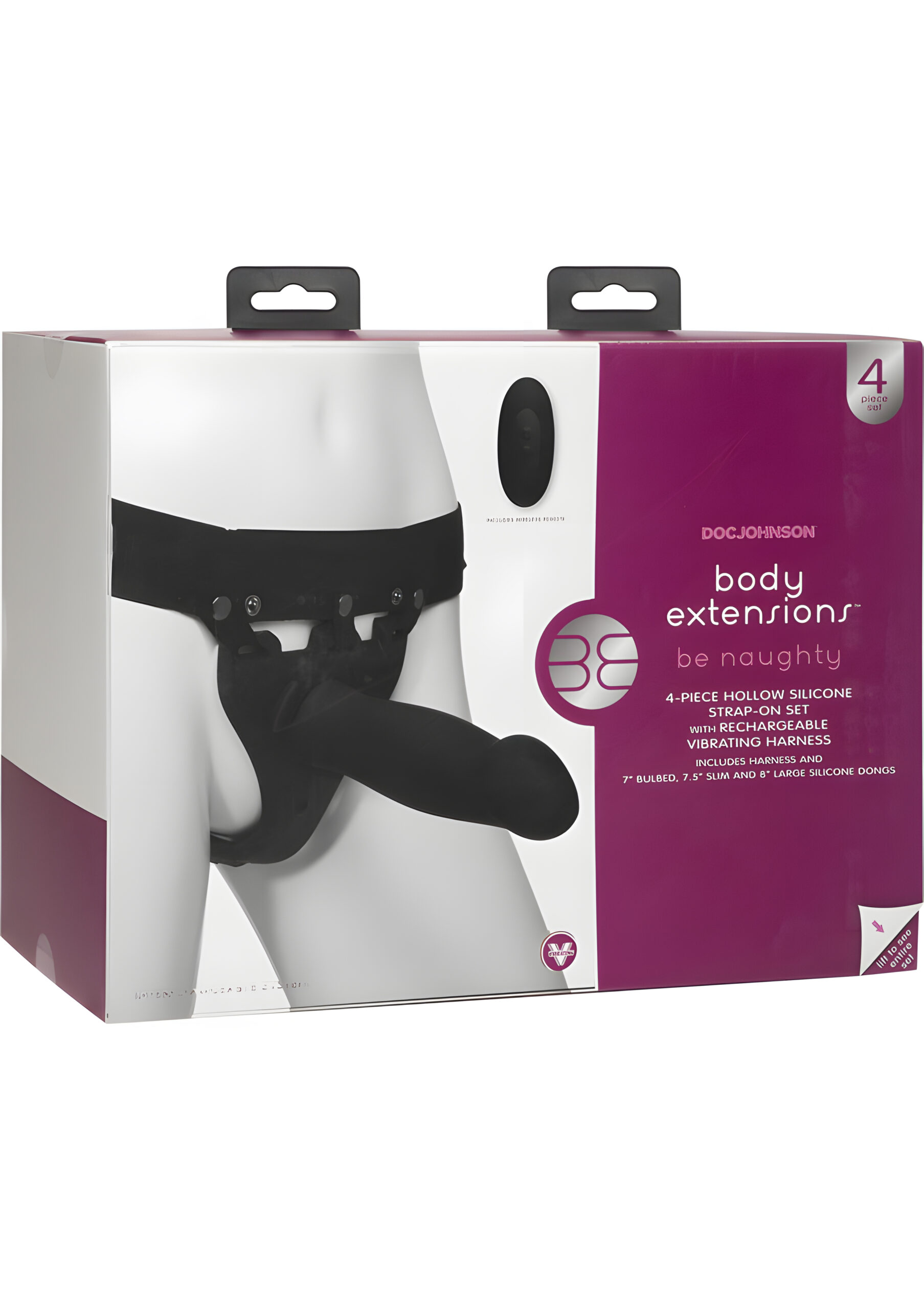 This four piece strap-on set includes 3 dildo attachments that are hollow and can optionally accommodate a man’s penis. They are made from soft pliable silicone that is ultra hygienic and body safe. There is a wireless vibrating bullet that can be placed inside the dildo attachments for added stimulation. The vibrator provides seven different vibration modes and three different speeds. Vibration is controlled with the wireless remote control. It is rechargeable and comes with a USB charging cord. The remote control uses 2 AAA batteries that are not included. The harness fits waists from 28 to 48 inches. It is made from silicone and elastic. The three attachments are all made from soft silicone that are hollow yet hold their shape. There is a slim dong that measures 7.5 inches long and 1.75 inches wide. The bulbed dong is 7 inches long and 1.75 inches wide. The largest dong is 8 inches long and 2 inches wide.