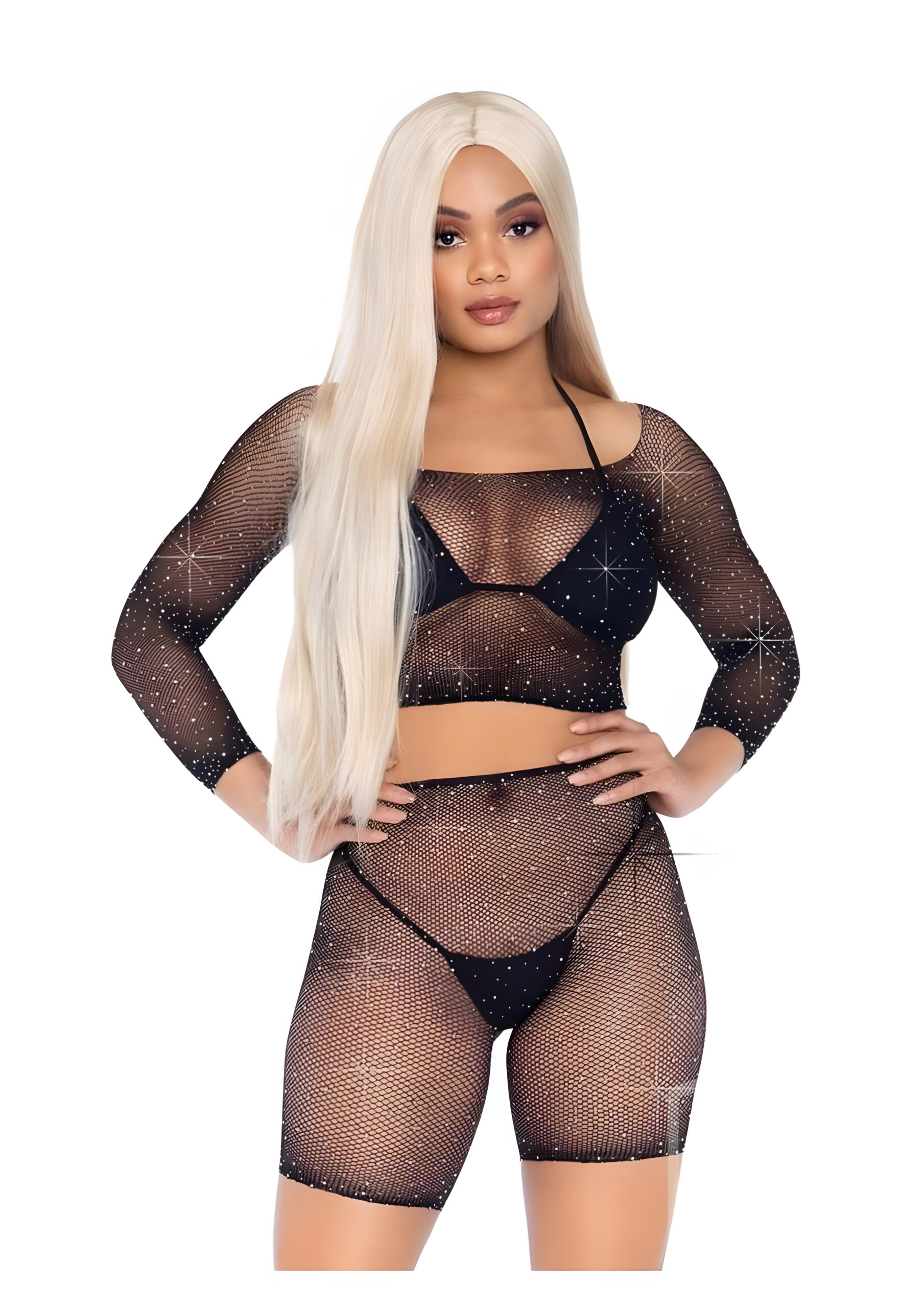 Introducing the 2 PC fishnet crop top and biker short set by Leg Avenue, a versatile addition to your wardrobe that will elevate your style quotient in an instant. This set is designed to fit most sizes, making it a perfect choice for those who value comfort as much as style. The set includes a long-sleeved see-through lingerie cropped top and matching fishnet bike shorts. The top and shorts are made from a stretchy, breathable net fabric that ensures you stay comfortable all day long. The long-sleeved crop top features a scoop neck, adding a touch of elegance to the overall design. The fishnet shorts complement the top perfectly, creating a cohesive look that is sure to turn heads wherever you go. One of the standout features of this set is its versatility. You can pair the top with jeans for a sexy lingerie top look, or wear it with a bikini for a cute Coachella outfit. The shorts can also be worn as a fun swimsuit cover-up. Please note that the bikini and panty are not included in the package. When it comes to care instructions, it’s recommended to hand wash the set in cold water. Avoid using bleach and let the set drip dry to maintain its quality and longevity. This 2 PC fishnet crop top and biker short set is not just a piece of clothing, it’s a fashion statement. It’s a testament to your bold and adventurous spirit, a reflection of your unique style. Whether you’re heading to a music festival, a beach party, or just hanging out with friends, this set will ensure you stand out from the crowd. The size chart for this set is as follows: One size fits most, with a dress size of OS, a bust measurement of 34.5-40.5 inches, a waist measurement of 26-32 inches, and a hip measurement of 36-42 inches. In conclusion, the 2 PC fishnet crop top and biker short set by Leg Avenue is a must-have for anyone who loves to experiment with their style. It’s sexy, it’s stylish, and it’s versatile. So why wait? Add this set to your wardrobe today and let your style do the talking. Remember, fashion is not just about following trends, it’s about expressing your individuality. And with this set, you can do just that. So go ahead, embrace your unique style, and let the world see the real you.