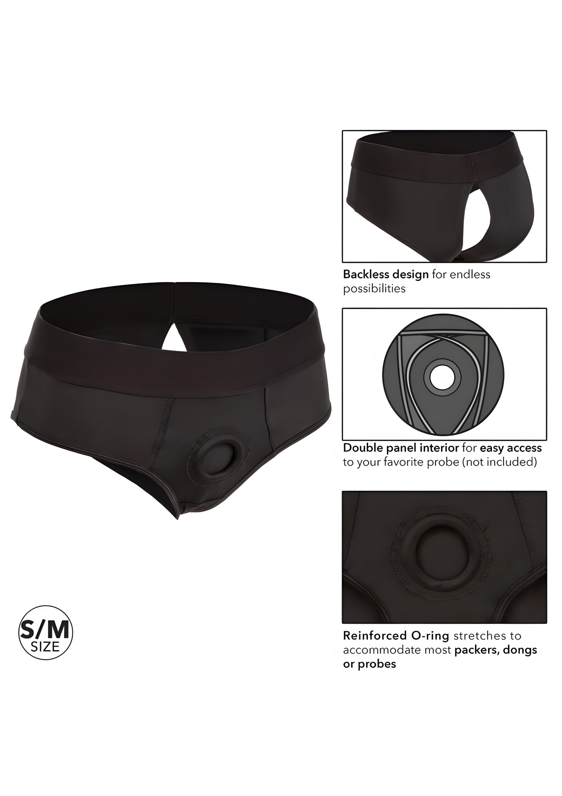 Introducing the Boundless Backless Brief, a garment that seamlessly blends everyday comfort with a touch of erotic functionality. This unique piece is designed for those who value both style and support, offering a form-fitting, open-back design that can be discreetly worn under your attire. Whether you’re heading out for a night on the town or staying in for a cozy evening, this brief is ready for those intimate moments. The Boundless Backless Brief is crafted with an extra wide waistband, providing unmatched support that stands up to even the most vigorous movements. This ensures that your chosen probe stays securely in place, giving you peace of mind and freedom of movement. The stretchy, high-quality fabric, combined with a soft lining, ensures comfortable wear, no matter how long your day or night lasts. One of the standout features of this brief is its thoughtfully constructed double panel interior. This design grants easy access to your preferred probe (not included), allowing for spontaneous play without the hassle of additional gear. The reinforced, stretchable O-ring at the core is adept at accommodating a wide array of dongs or probes, making versatility its virtue. The Boundless Backless Brief offers a discreet yet daring approach to pleasure. Whether it’s for a night out or in, this harness delivers comfort, style, and readiness for wherever your pleasure takes you. The brief is available in a classic black color, ensuring it pairs well with any outfit. With a 1 Year Warranty, you can rest assured that this product is built to last. The brief is also phthalate-free, making it a safe choice for those with sensitive skin. While the brief is waterproof, it is recommended to hand wash only to maintain its quality and longevity. The material composition of the brief is as follows: Fabric: 78% Nylon, 22% Spandex Waistband: 48% Nylon, 35% Polyester, 17% Spandex Weighing in at just 2 ounces, the Boundless Backless Brief is lightweight and easy to wear. Its sleek design ensures that it remains discreet under clothing, while still providing the support and functionality you need. In summary, the Boundless Backless Brief is the perfect combination of comfort and functionality. Its open-back design and reinforced O-ring make it ideal for those who appreciate a little extra excitement in their lives. Whether you’re looking for a discreet harness for everyday wear or something a bit more daring for special occasions, this brief has you covered. So, why not add a touch of adventure to your wardrobe with the Boundless Backless Brief? It’s the perfect choice for those who want to combine style, comfort, and a hint of mischief. Just remember to hand wash it, because even the most adventurous briefs need a little TLC.