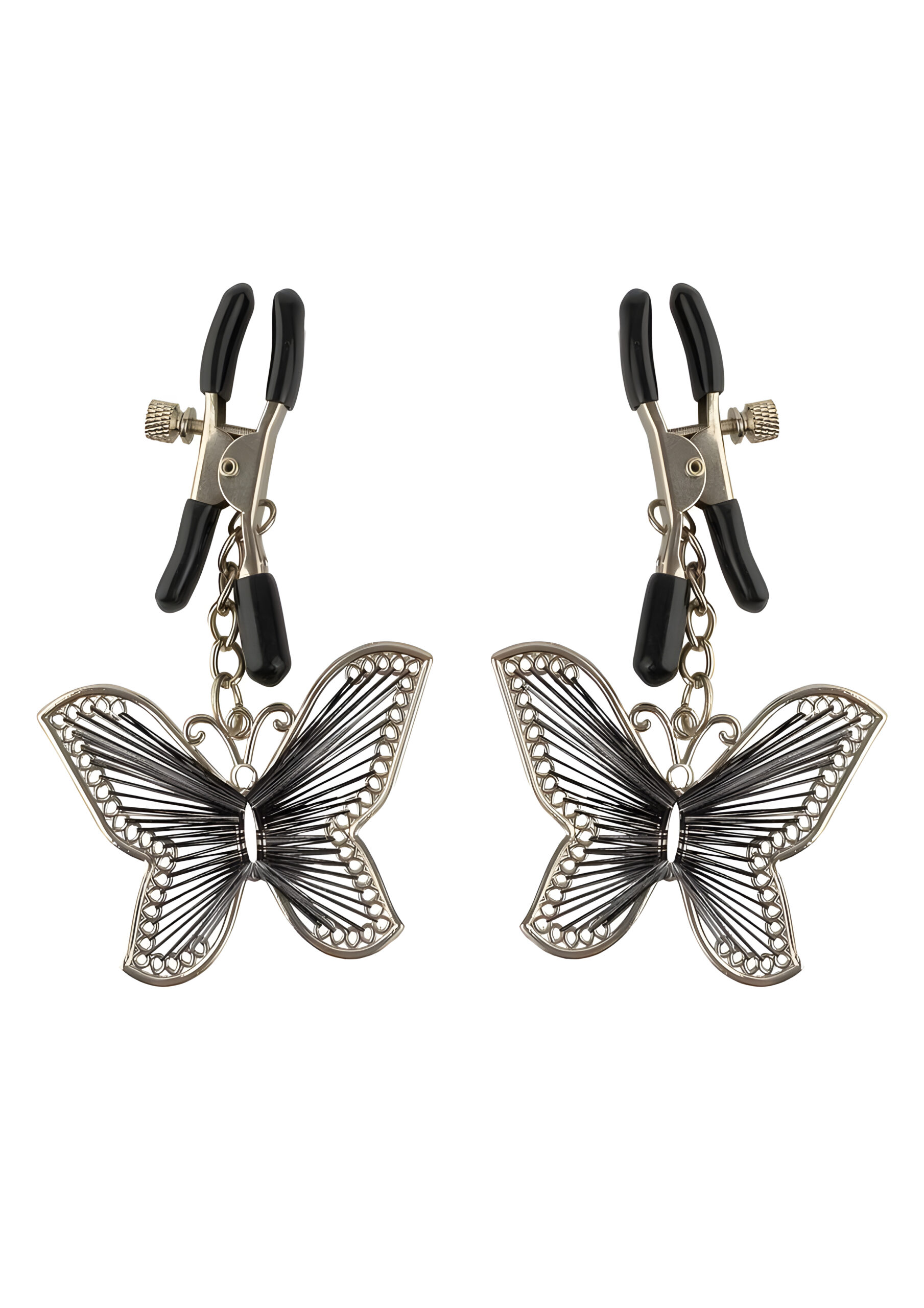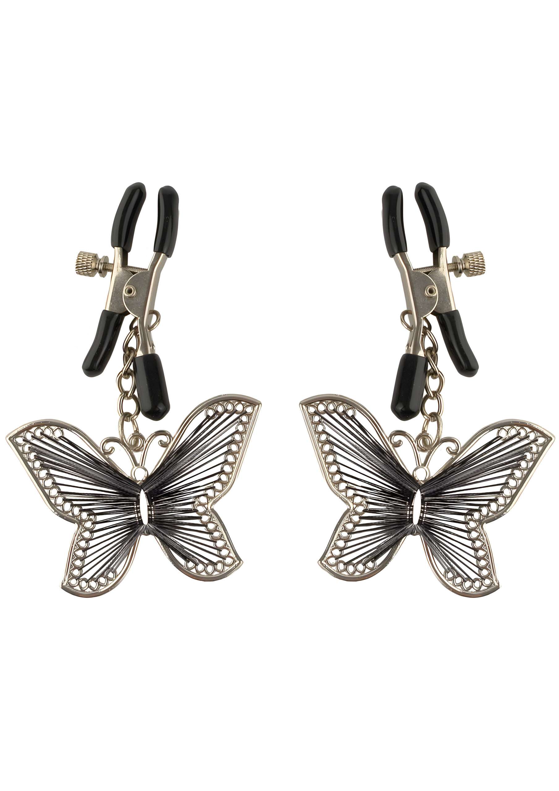 These fun and stylish nipple clamps feature a butterfly charm that dangles from each. The clamps are durable metal with adjustable tension via a thumb screw. Soft rubber sleeves protect the nipples but can be removed if you like it rougher. The butterfly charms look great and also provide stimulation with their gentle tug as they dangle from your nipples.