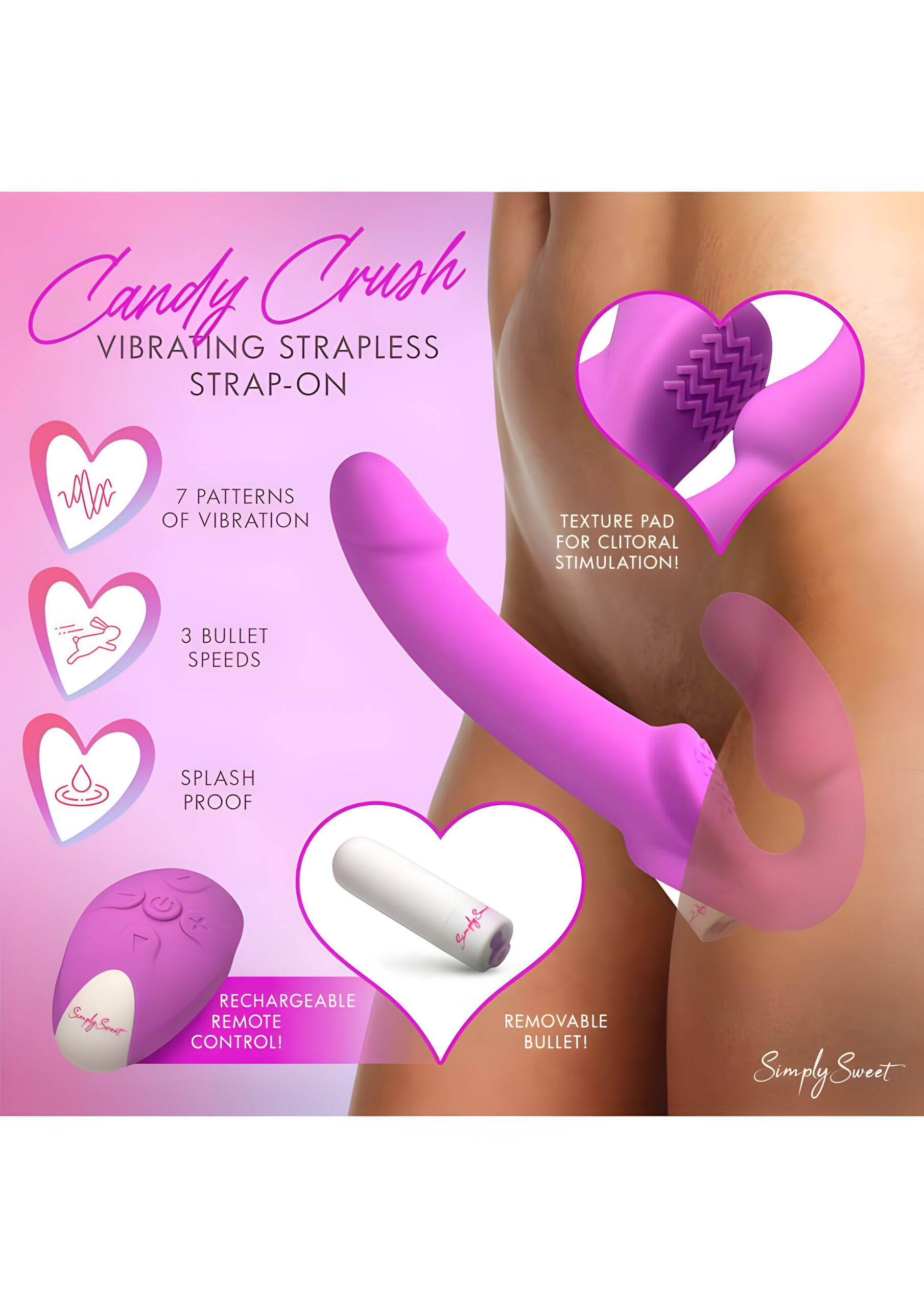 Elevate your intimate moments with the Simply Sweet Candy Crush strapless strap-on, a thoughtfully designed toy that combines innovation, comfort, and pleasure. This hands-free device is held securely in place using your kegel muscles, giving you full control while freeing up your hands for other activities. The strapless design eliminates the need for traditional harnesses, allowing for a more natural and connected experience between partners. Whether you’re exploring new dynamics or simply looking to enhance your playtime, the Candy Crush offers an exciting and versatile option for shared pleasure.One of the standout features of the Candy Crush is its remote-controlled vibrations, which provide access to 4 speeds and 7 distinct patterns. These vibrations are strategically designed to travel through the entire toy, including the shaft, the insertable bulb, and the textured clitoral pad. This ensures simultaneous stimulation for both the wearer and their partner, creating a mutually satisfying experience. The included rechargeable remote allows you to easily switch between settings without interrupting the moment, keeping the focus on connection and enjoyment. Both the removable bullet vibrator and the remote are USB rechargeable, ensuring that the fun is always just a charge away.Ergonomics play a key role in the Candy Crush’s design. The long, streamlined shaft is crafted for comfortable and effective thrusting, allowing for natural movement without compromising your stance or position. The insertable bulb is shaped to fit snugly within the wearer’s body, held securely by kegel muscles for a hands-free experience. Meanwhile, the textured clitoral pad adds an extra layer of pleasure, ensuring that the wearer is just as stimulated as their partner. This thoughtful design prioritizes comfort and pleasure for both parties, making it an excellent choice for couples looking to explore strapless strap-ons.Crafted from premium silicone, the Candy Crush features a silky smooth texture that feels luxurious against the skin. This high-quality material is not only gentle but also easy to clean, ensuring a safe and hygienic experience every time. With an IPX5 splashproof rating, the toy can handle splashes of water, making it suitable for most intimate play settings. While it’s not fully submersible, it’s durable enough for regular use and simple maintenance. The vibrant purple color adds a playful and inviting aesthetic, making it as visually appealing as it is functional.Measurements:Overall length: 9.4 inchesInsertable length of the dildo: 6 inchesWidest insertable diameter of the dildo: 1.5 inchesNarrowest insertable diameter of the dildo: 1.2 inchesInsertable length of the bulb: 4 inchesWidest diameter of the bulb: 1.5 inchesMaterials and color:The Candy Crush is made from premium silicone and plastic, offering a soft, smooth texture that feels gentle on the skin. Its vibrant purple color adds a fun and playful touch to your intimate collection, making it a standout piece in any toy drawer.Usage suggestions:To get started, apply a generous amount of water-based lubricant to both the bulb and the shaft. This ensures a smoother, more comfortable experience for both partners. Insert the bulb into the wearer, using kegel muscles to hold it securely in place. Take a moment to adjust and find a comfortable position before diving into the fun. Once you’re ready, use the remote to explore the 4 speeds and 7 vibration patterns. Experiment with different settings to discover what works best for you and your partner. The ergonomic design allows for natural movement, so feel free to explore various positions and rhythms that enhance the experience for both of you.The textured clitoral pad is a game-changer for the wearer, providing additional stimulation with every thrust. This feature ensures that the wearer enjoys as much pleasure as their partner, making the Candy Crush a truly shared experience. For added excitement, consider letting your partner take control of the remote, allowing them to surprise you with different vibration patterns and intensities. This can add an element of playful anticipation and deepen the connection between you.After your session, cleaning the Candy Crush is simple. Use warm water and a toy-safe cleaner to thoroughly clean the toy, paying special attention to the textured areas. Allow it to air dry completely before storing it in a cool, dry place. Be sure to recharge the bullet vibrator and remote using the included USB cable, so your toy is ready to go whenever inspiration strikes.