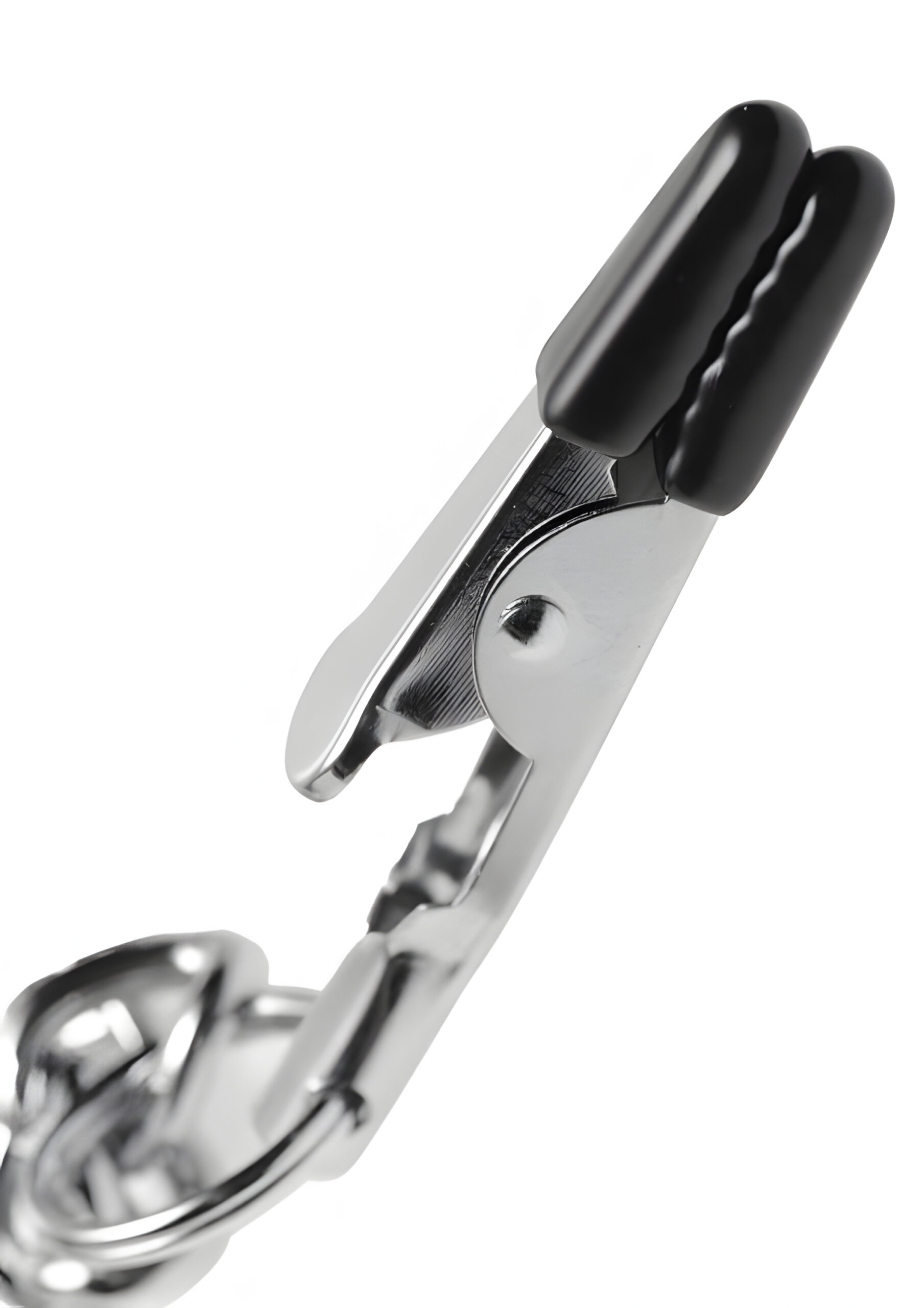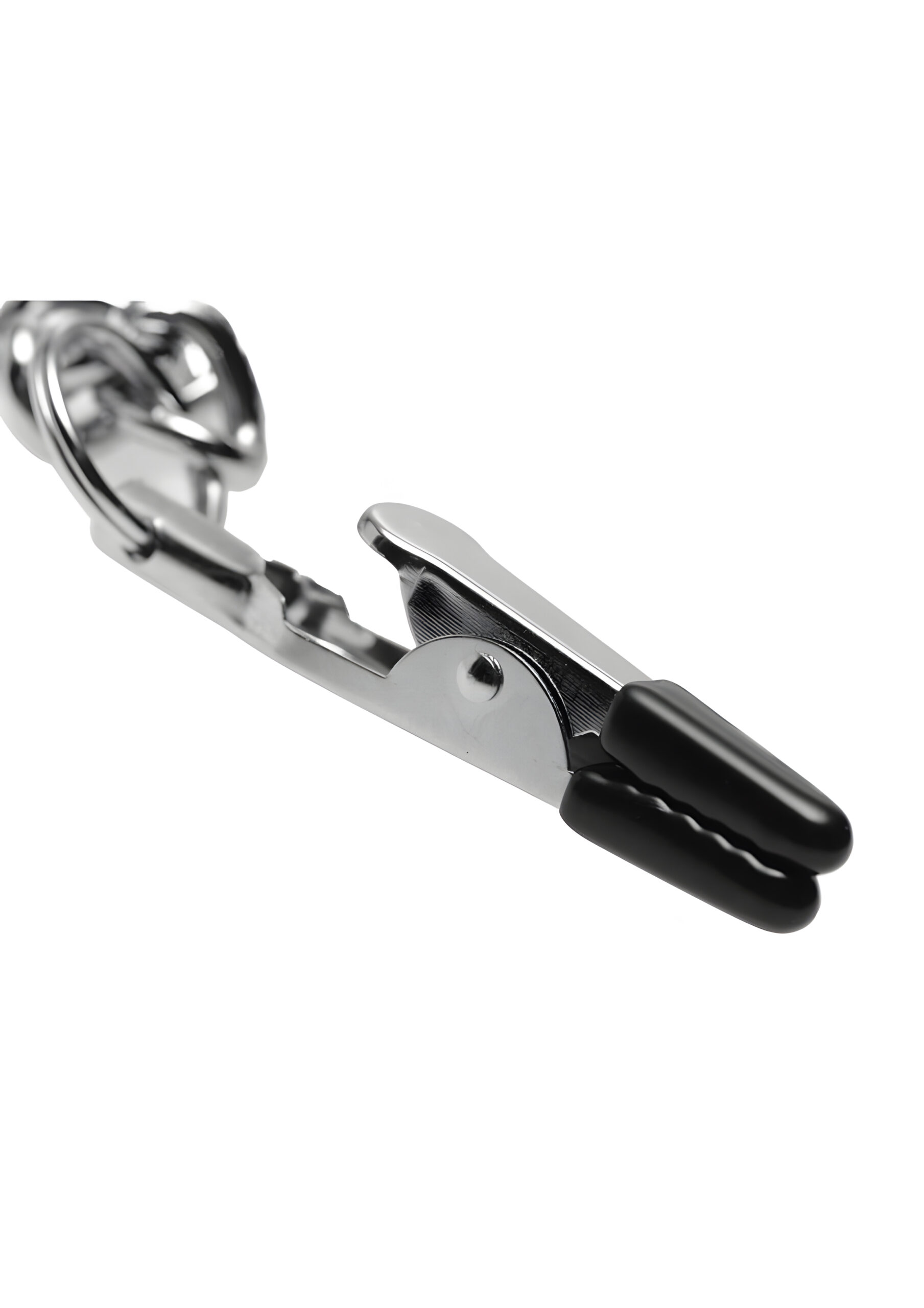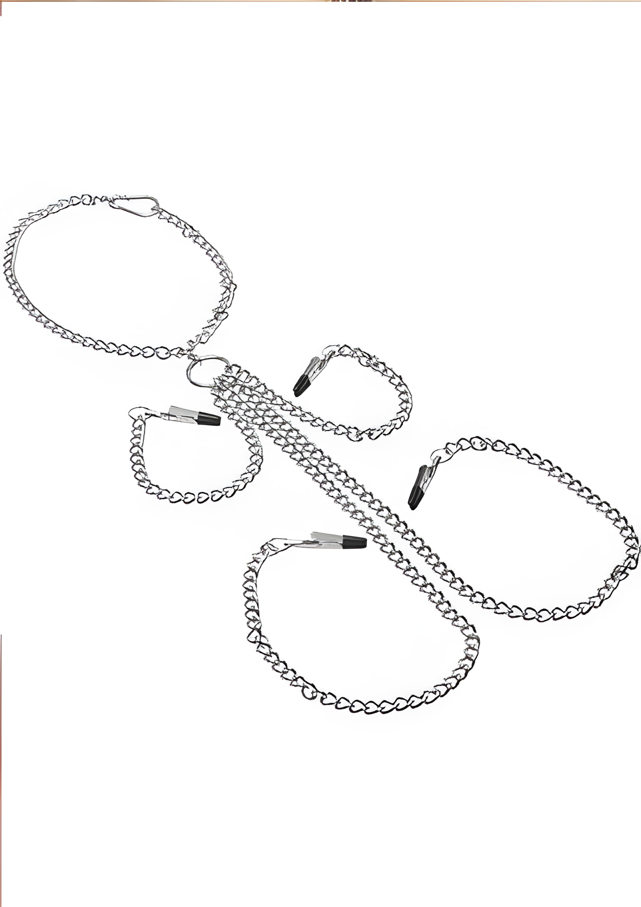 A steel ring connects it all together. Non-tarnishing heavy-duty chain around the neck, to each nipple clamp and to two labia clamps. The clamps are vinyl tipped to protect nipples and labia. The clamps are not adjustable and have a medium tension. This set can also be used on a man by clamping the labia clamps onto his scrotum or penis.