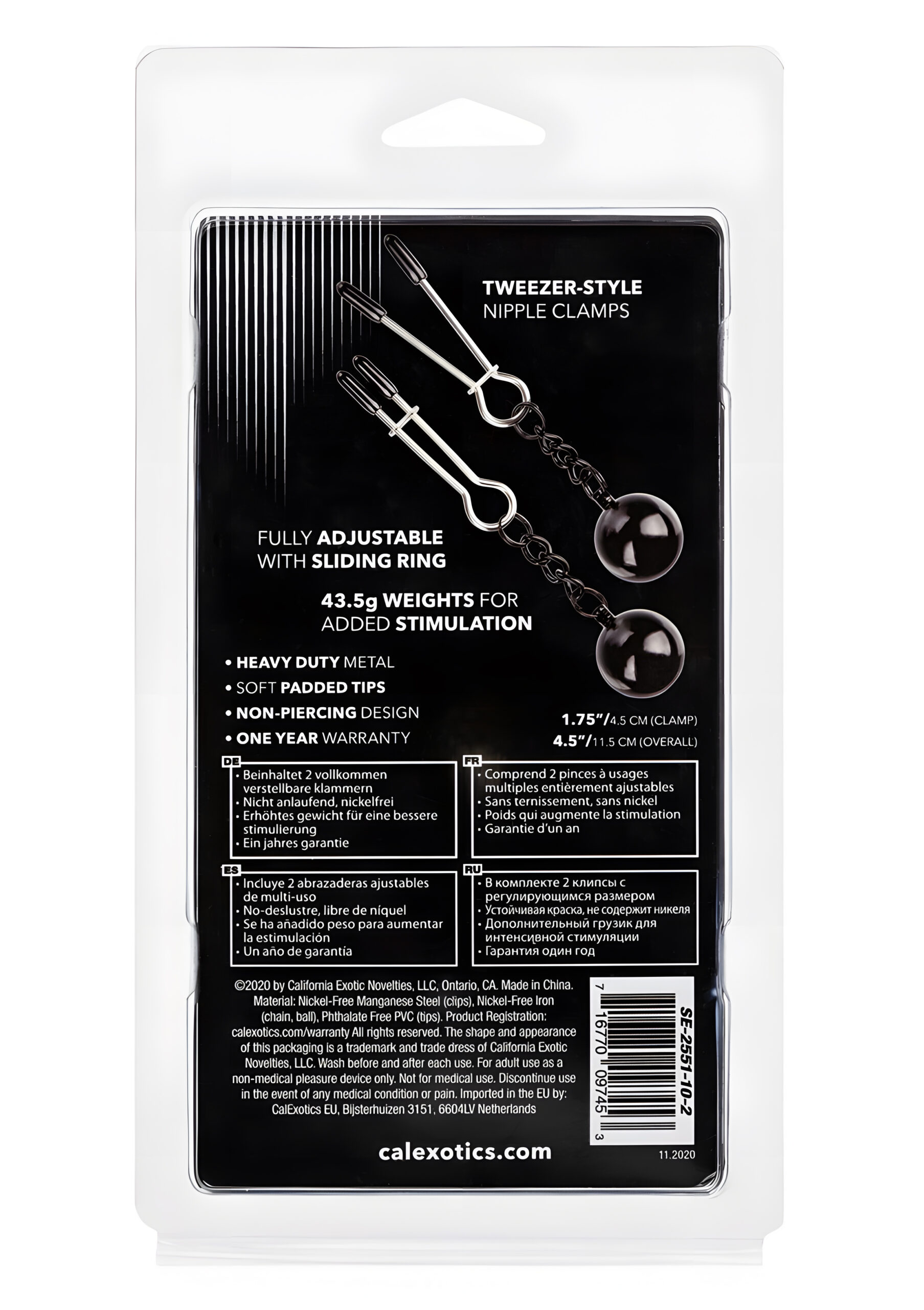 Introducing the Nipple Grips Weighted Tweezer Nipple Clamps, the ultimate accessory for those seeking an exquisite blend of sensation and intensity in their play. This set includes two fully adjustable, multi-use clamps designed to elevate your pleasure to new heights. Whether you’re a seasoned enthusiast or a curious beginner, these clamps promise to deliver a unique experience that will leave you wanting more. The unique tweezer-style design features fully adjustable sliding rings. This innovative construction allows you to customize the pressure, ensuring the perfect balance between comfort and exhilaration. No more guessing games or awkward adjustments; simply slide the rings to your desired tension and let the fun begin. The addition of soft and comfortable pads ensures that your experience remains enjoyable throughout your playtime, so you can focus on the sensations without any distractions. Crafted from heavy-duty metal, these nipple clamps are built to withstand even the most passionate encounters, ensuring their durability and longevity. They are also non-tarnishing and nickel-free, prioritizing your safety and satisfaction. You can rest easy knowing that these clamps are designed with your well-being in mind, allowing you to explore your desires without worry. To intensify your sensations, these clamps come with added weight, creating a tantalizing tugging sensation that will leave you yearning for more. The weights are perfectly balanced to provide just the right amount of pull, enhancing your experience without overwhelming you. Embrace the world of pleasure with the Nipple Grips Weighted Tweezer Nipple Clamps and experience the perfect combination of comfort and exhilaration. Product Details: SKU: SE-2551-10-2 Color: Silver Warranty: 1 Year Warranty Features: Wearable, Phthalate Free, Adjustable Material Type: Nickel-Free Manganese Steel (clips), Nickel-Free Iron (chain, ball), Phthalate Free PVC (tips) Measurements: 43.5 g/1.5 oz. (weights), 1.75 in/4.5 cm (each clamp), 4.5 in/11.5 cm (overall length) Weight: 3.5 oz Now, let’s talk about usage suggestions. First and foremost, remember that communication is key. Discuss your boundaries and desires with your partner before diving into the world of nipple clamps. Once you’re both on the same page, start by gently placing the clamps on your nipples. Adjust the sliding rings to find the perfect pressure that suits your comfort level. Remember, it’s all about finding that sweet spot between pleasure and intensity. For those looking to spice things up, try incorporating the clamps into your foreplay routine. The added weight provides a constant reminder of their presence, heightening your arousal and anticipation. You can also experiment with temperature play by cooling or warming the clamps before use. Just be sure to test the temperature on your wrist first to avoid any surprises. The Nipple Grips Weighted Tweezer Nipple Clamps are a versatile and exciting addition to any collection. With their adjustable design, durable construction, and tantalizing weight, they offer a unique experience that is sure to please. So go ahead, embrace the world of pleasure and discover the perfect combination of comfort and exhilaration with these delightful clamps. Just remember to keep a sense of humor and enjoy the journey.
