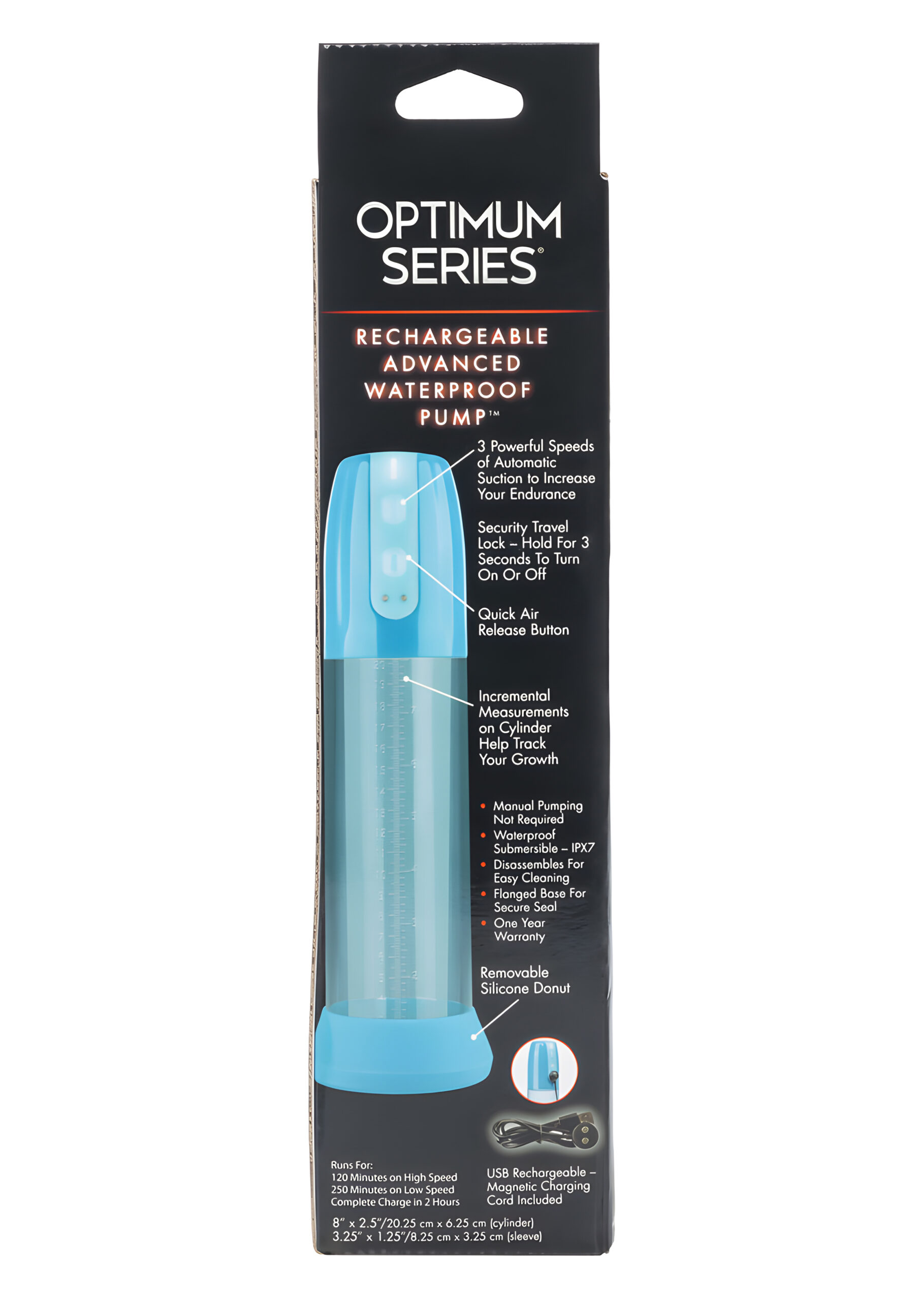 Increase your endurance and maximize your pleasure with the Optimum Series Rechargeable Advanced Waterproof Pump. This sleek, durable, and thoughtfully designed automatic pump is here to elevate your experience, whether you’re a curious beginner or a seasoned pro. Its advanced features and user-friendly design make it an ideal choice for anyone looking to enhance their routine and achieve their goals with ease and comfort.The pump offers three powerful speeds of automatic suction, giving you full control over the intensity of your experience. Whether you’re in the mood for a gentle, gradual build-up or a more robust and intense session, the adjustable settings make it easy to tailor the experience to your preferences. The ultra-flanged base ensures a secure seal during use, so you can focus on the moment without worrying about interruptions. For added comfort and a personalized fit, the removable silicone donut provides a soft, snug cushion. The clear cylinder, marked with incremental measurements, allows you to track your progress over time, giving you tangible results to work toward and celebrate.Safety and convenience are at the heart of the Optimum Series Rechargeable Advanced Waterproof Pump’s design. A quick air release button is included to give you instant control over the pressure, ensuring a safe and comfortable experience every time. The materials used in its construction are body-safe, including ABS for the controller, PS for the cylinder, and premium silicone for the buttons and donut. These high-quality materials not only ensure durability but also prioritize your health and safety. Plus, the waterproof design, with an IPX7 rating, means you can take your play to the shower or bath, adding a refreshing and versatile twist to your routine. Whether you’re unwinding after a long day or starting your morning with a boost, this pump is ready to join you.Cleaning and maintenance are refreshingly simple. The pump can be fully disassembled, allowing you to thoroughly clean each component with warm water and mild soap or a suitable toy cleaner. Once cleaned, allow the parts to dry completely before reassembling and storing. For those who value discretion, the pump includes a security travel lock to prevent accidental activation during storage or transport. Activating or deactivating the lock is as simple as holding the button for three seconds, making it a practical choice for travel or discreet storage at home.The Optimum Series Rechargeable Advanced Waterproof Pump is powered by a magnetic USB rechargeable battery, offering convenience and reliability. A full charge takes just two hours, and the device provides up to 120 minutes of use on the highest speed setting or an impressive 250 minutes on the lowest speed. The included USB charging cord ensures you’ll always have a way to recharge, so you can count on your pump being ready whenever you are. With such a long-lasting battery life, you’ll have plenty of time to explore and enjoy its features without frequent interruptions.Usage suggestions: To get started, apply the pump to the desired area, ensuring the silicone donut is in place for added comfort and a secure fit. Use the quick air release button to adjust the pressure as needed, and take your time experimenting with the three suction speeds to discover what works best for you. The clear cylinder’s measurement markings are a helpful tool for tracking your progress, so consider using the pump regularly to achieve your desired results. After each use, disassemble the unit and clean it thoroughly with warm water and mild soap or a specialized toy cleaner. Once dry, reassemble the pump and store it in a cool, dry place, utilizing the travel lock for added security if needed.With its combination of advanced features, intuitive design, and high-quality materials, the Optimum Series Rechargeable Advanced Waterproof Pump is a reliable and enjoyable tool for enhancing your performance, pleasure, and confidence. Whether you’re exploring this type of device for the first time or upgrading to a more advanced model, this pump has everything you need for a satisfying and customizable experience. Its sleek design, ease of use, and thoughtful details make it a standout choice for anyone looking to take their routine to the next level.Incorporating the Optimum Series Rechargeable Advanced Waterproof Pump into your routine is a simple yet effective way to boost your confidence and achieve your goals. Whether you’re using it as part of a regular regimen or as an occasional enhancement, its versatility and reliability make it a valuable addition to your collection. With features like adjustable suction speeds, a comfortable silicone donut, and a waterproof design, this pump is designed to adapt to your needs and preferences. From its easy-to-use controls to its travel-friendly lock, every detail has been crafted with your convenience and enjoyment in mind. Take the first step toward a more confident and satisfying experience with the Optimum Series Rechargeable Advanced Waterproof Pump.