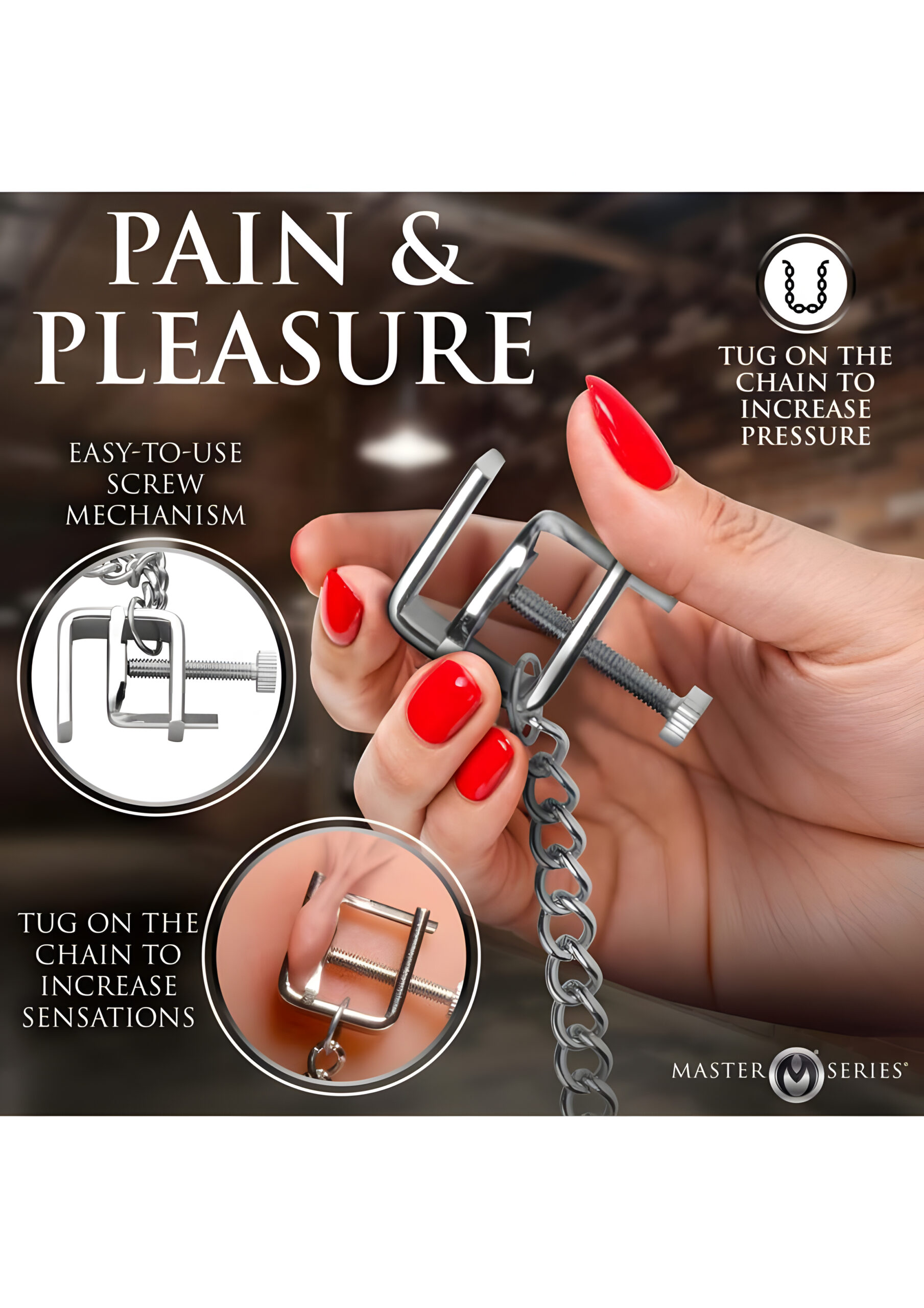 Looking to add a touch of excitement to your intimate moments? Meet the Pressure Clamps, your new best friends in the realm of pleasure and pain. These vice clamps are designed to apply just the right amount of pressure on the nipples, making them an essential addition to your collection of adult accessories. Whether you’re a seasoned enthusiast or a curious beginner, these clamps offer a customizable experience that caters to your unique preferences. One of the standout features of these clamps is their adjustability. With a simple twist of the screw, you can precisely control the pressure applied, allowing you to increase or decrease it to your liking. This means you can start off gently and gradually intensify the sensation as you become more comfortable. It’s like having a volume knob for your pleasure, but instead of sound, it’s all about the feels. Now, let’s talk about the pull chain. This isn’t just any ordinary chain; it’s the unsung hero of the setup. Connecting the two clamps, it ensures they stay together, so you won’t have to worry about losing one in the heat of the moment. But that’s not all. The chain also adds an extra dimension to your experience. Give it a gentle tug or a playful pull, and you’ll instantly feel the pressure and pain intensify. It’s like a game of tug-of-war, but you’re always the winner. For those with sensitive skin, you’ll be pleased to know that these clamps are made from nickel-free, body-safe metal. This makes them perfect for anyone who wants to avoid irritation while still enjoying the thrill of metal against skin. Plus, the metal construction opens up a world of possibilities for temperature play. Warm them up for a cozy sensation or cool them down for a chilling thrill. Either way, you’re in for a treat. Let’s dive into the specifics: Measurements: The clamps measure 1.1 inches in length and 1.4 inches in width, opening up to 0.5 inches wide. The chain connecting them is 13 inches long, providing ample room for movement and play. Materials: Crafted entirely from metal, these clamps are as durable as they are delightful. Color: A sleek silver finish gives them a classic look that pairs well with any outfit—or lack thereof. In summary, these pressure clamps are more than just a novelty item; they’re a gateway to new heights of thrilling exploration. Whether you’re experimenting with pain and pleasure or simply looking to spice things up, these clamps offer a personalized experience that’s hard to beat. So why not give them a try? After all, life’s too short for boring bedroom antics. Remember, when it comes to pleasure, it’s all about finding what works for you. So go ahead, twist that screw, tug that chain, and discover a world of sensations you never knew existed. Just be sure to keep a safe word handy, because you never know when things might get a little too intense.