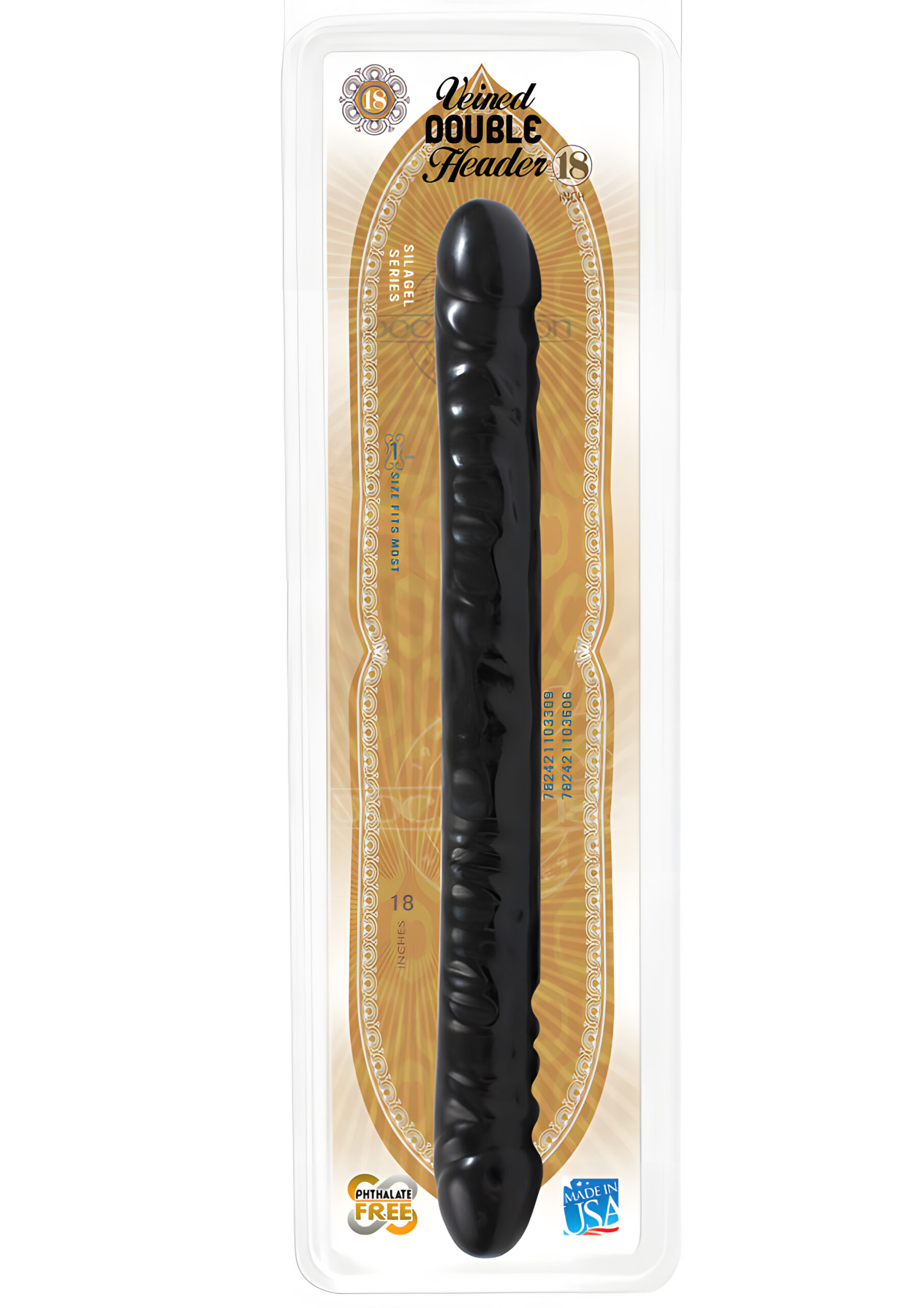 Available in flesh color also, add to cart for color selection. This double dong is perfect for some cheek to cheek time, but since it is pliable and can be doubled over, it can also be used for double penetration. Made from PVC rubber with our Sil-A-Gel formula, it is antibacterial and phthalate free. It features a head on each end and veined shaft. The shaft has a width of one and a half inches making it a really nice size, filling but not too wide and with a total of eighteen inches long there is plenty of dildo for two people. This dildo can be used with any personal lubricant including oil, silicone or water based, and it is made right here in the USA.