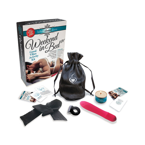Weekend in Bed Good Vibes Activity Kit is everything you need for an electrifying weekend of fun. This seven piece set includes a silicone bullet vibrator, a vibration cock ring, massage candle satin tie/blindfold 2 decks of activity cards in a convenient travel bag.